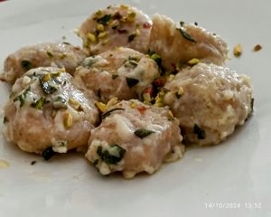 Bottoni di patate ripieni di zola , con pesto di salvia e mandorle