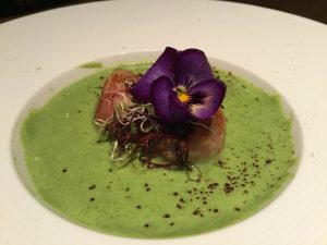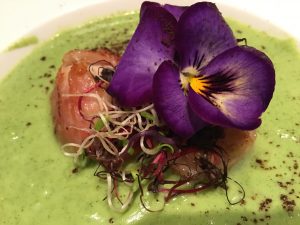 Servire la vellutata di zucchine con due capesante per ciascun piatto e completare con la polvere di caffè e qualche fiore edibile.