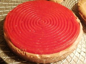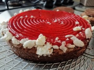 In questa ricetta ho voluto preparare una crostata, dove le fragole si trasformano in una fresca gelée e il ripieno è fatto da una soffice mousse il tutto viene inserito in uno scrigno di frolla al cacao e decorato con un crumble di meringa.