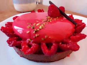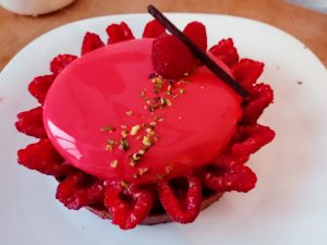 Tagliare a metà i lamponi freschi ed adagiarli intorno alla cupola di Namelaka in modo da coprire lo spazio che rimane tra questa e la frolla.