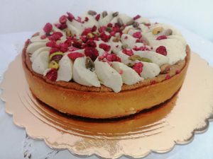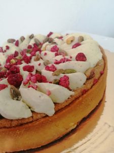 Uno degli accostamenti che preferisco in pasticceria è quello tra pistacchio, con il suo sapore avvolgente e con una punta di sapidità e il lampone con il suo sapore fresco, leggermente acidulo .