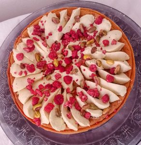 Da tempo volevo preparare una crostata moderna con questo accostamento, quindi ho rivisitato la ricetta del grande Pastry chef Luca Montersino della crostata con crema frangipane al pistacchio, ho aggiunto una soffice ganache al pistacchio ed infine ho decorato con lamponi disidratati e pistacchi interi.
