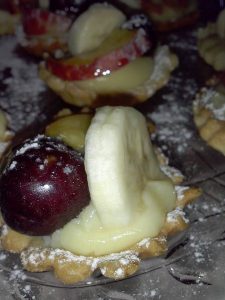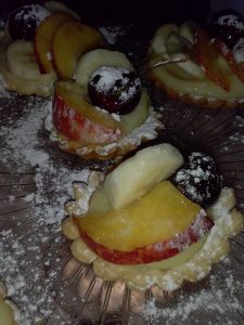 Io avevo preparato le Crostatine durante il periodo estivo utilizzando quindi due frutti di stagione, pesche e ciliegie, naturalmente tutti i tipi di frutta si prestano, fragole kiwi, banane, uva ,l’importante è utilizzare frutta che dia una nota di colore.