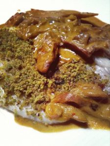 Togliere il rombo dal forno e servirlo nei piatti con i funghi allo zafferano.