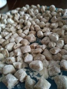 Quando l’impasto sarà ben compatto trasferirlo sulla spianatoia spolverizzata di farina e formare tanti cordoni dello spessore di un paio di cm .