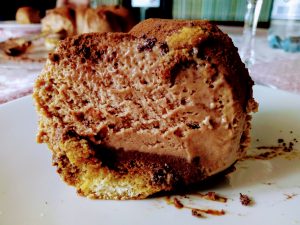 Una mousse al cioccolato al latte, un cremoso al fondente e naturalmente il biscotto morbido con una bagna al caffè aromatizzato al Rhum