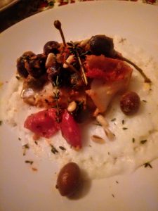 In questo piatto ho giocato con i contrasti tra il bianco della polenta e del baccalà, il rosso dei pomodorini e i colori dei capperi e Delle olive taggiaasche.