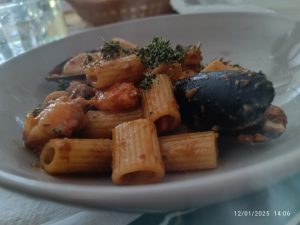 Completano poi il condimento cozze e gamberi che vengono cotti i padella e poi aggiunti alla pasta.