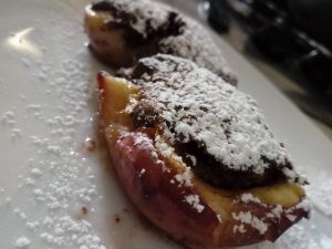 Al momento di servire spolverizzare le pesche con lo zucchero a velo.