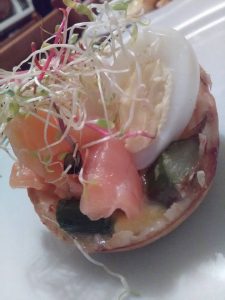 A cottura ultimata togliere dal forno e decorare ogni quiches con mezzo ovetto  una fettina di salmone.