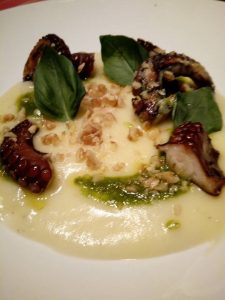 In ogni piatto disporre qualche cucchiaio di vellutata di patate, qualche cucchiaino di pesto per dare un po’ di colore, sistemarsi i tocchetti di polpo e completare con la granella di noci e le foglioline di basilico.