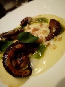 Il polpo viene leggermente caramellato ( dovevo pur provare da sola  una tecnica che avevo imparato ai corsi), e servito su una vellutata di patate.