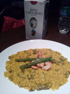 Asparqgi e zafferano, sapevo essrre un accostamento vincente, un riso super, e una particolare qualita di gamberi, quelli violetti di Gallipoli, dal colore intenso., difficili ms non impossibili da trovare, che danno un tocco chic al piatto.