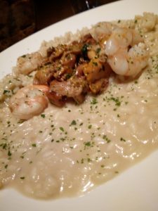 Servire il.risotto nei piatti con al centro un cucchiaio di ragù di funghi e un paio di gamberi .