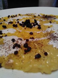 Due consistenze di caffè poi per ultimare il piatto, le perle (vedi la ricetta nella sezione esperimenti) e la polvere che viene spruzzata di sopra.