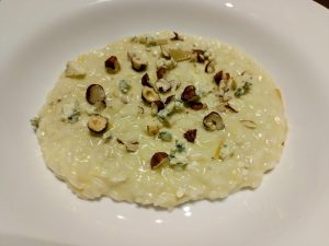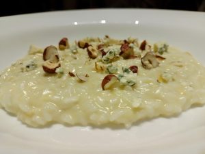 Togliere dal fuoco e mantecare con il parmigiano e con il Roquefort, quindi distribuire il risotto nei piatti.