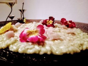 Per festeggiare l’arrivo della primavera ho realizzato questo risotto dal sapore delicato e dai colori vivi, grazie anche ai fiori eduli e dalla nota chic data dal pesce spada crudo e leggermente marinato.