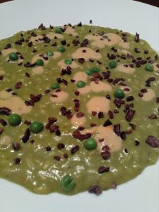 A metà cottura del riso unire una parte della crema di piselli, proseguire la cottura per altri dieci minuti, unire il parmigiano, il burro, l’altra metà di crema di piselli .