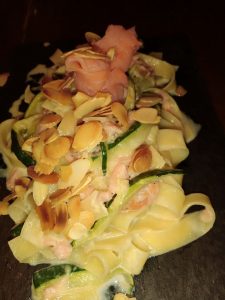 In questa ricetta si sposa perfettamente con il sapore leggermente amarognolo delle zucchine, e con quello tostato delle mandorle.