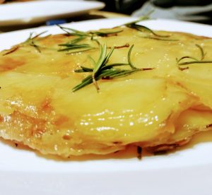 Ho rivisitato la classica versione della famosa Tarte Tatin e ne ho proposto una  salata ( ma con quella punta di dolce data dal caramello), utilizzando le patate.