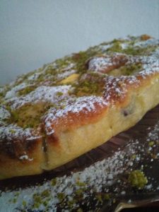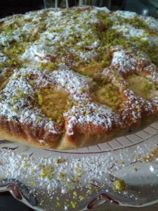 Una torta morbida e fragrante, che unisce al sapore della mela quello del mirtillo rosso e la dolcezza del pistacchio, che crea anche un piacevole effetto cromatico.
