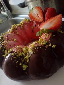 Estrarre quindi il dolce dallo stampo in silicone e con l’apposito separatore in dotazione allo stampo  colare prima la glassa rosa all’interno e quella al cacao all’estermo .