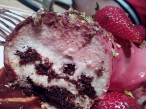 la torta è stata realizzata con una base di marquise al cacao , una mousse alla fragola, e una freschissima mousse allo yogurt.